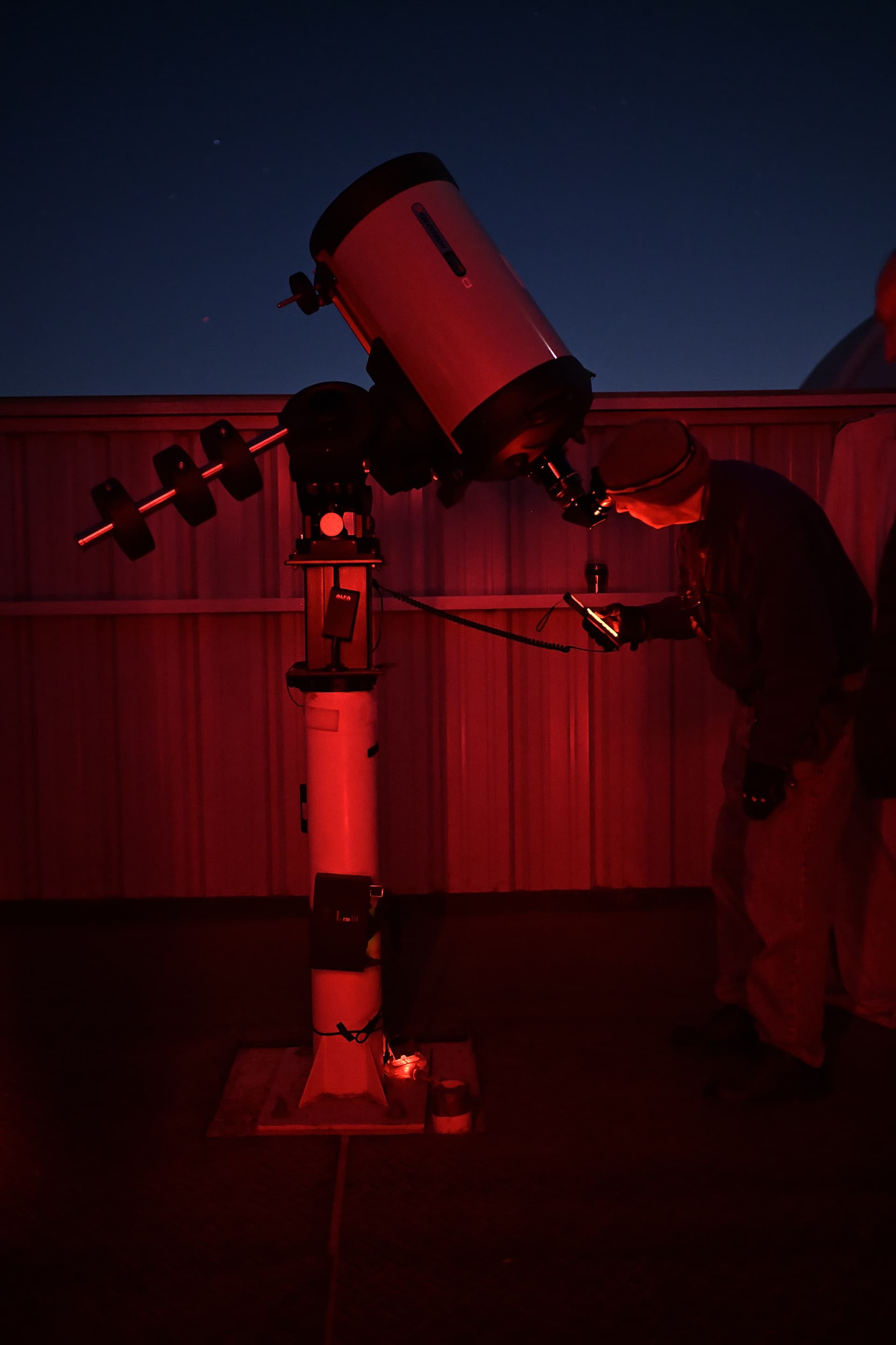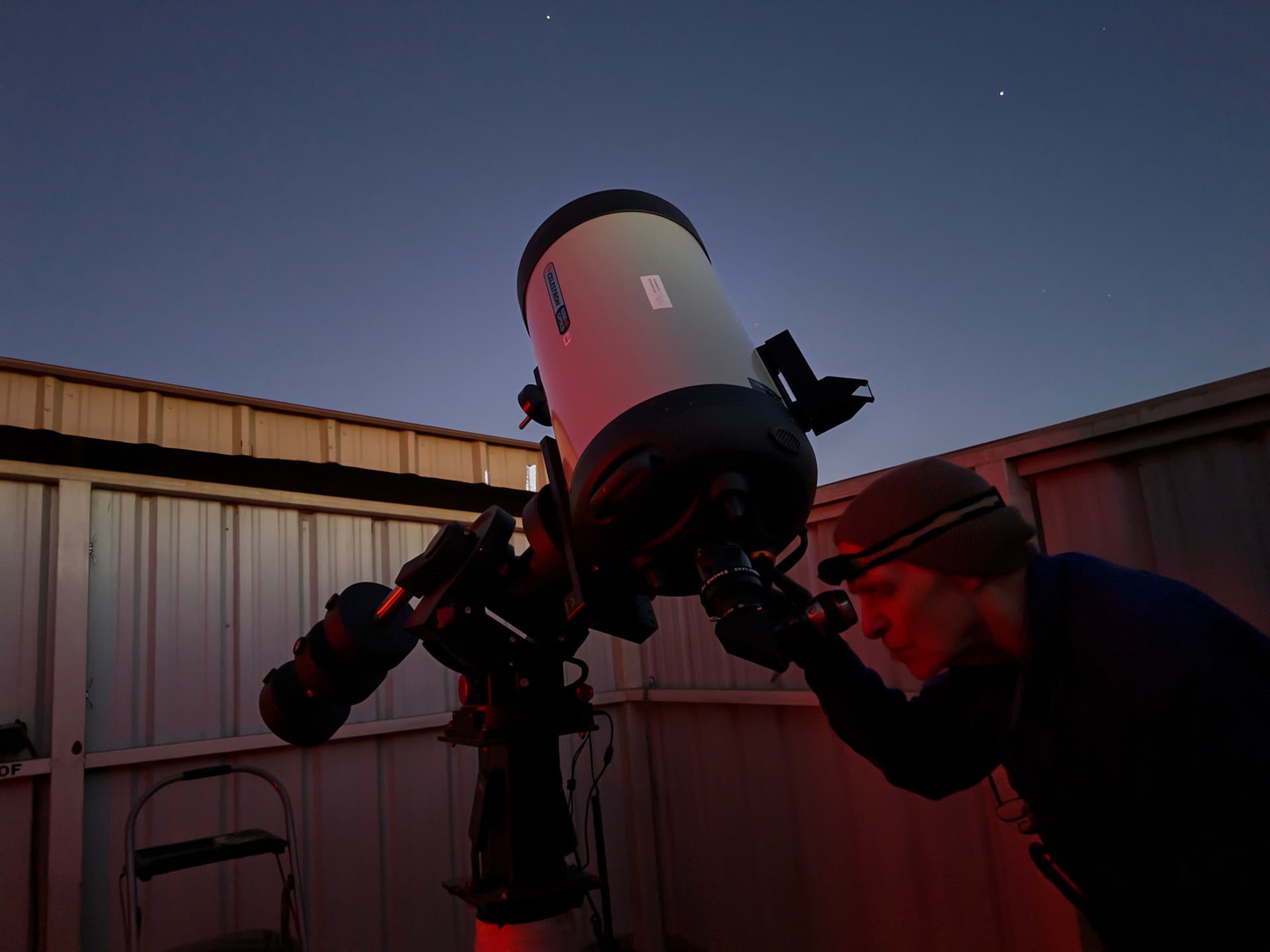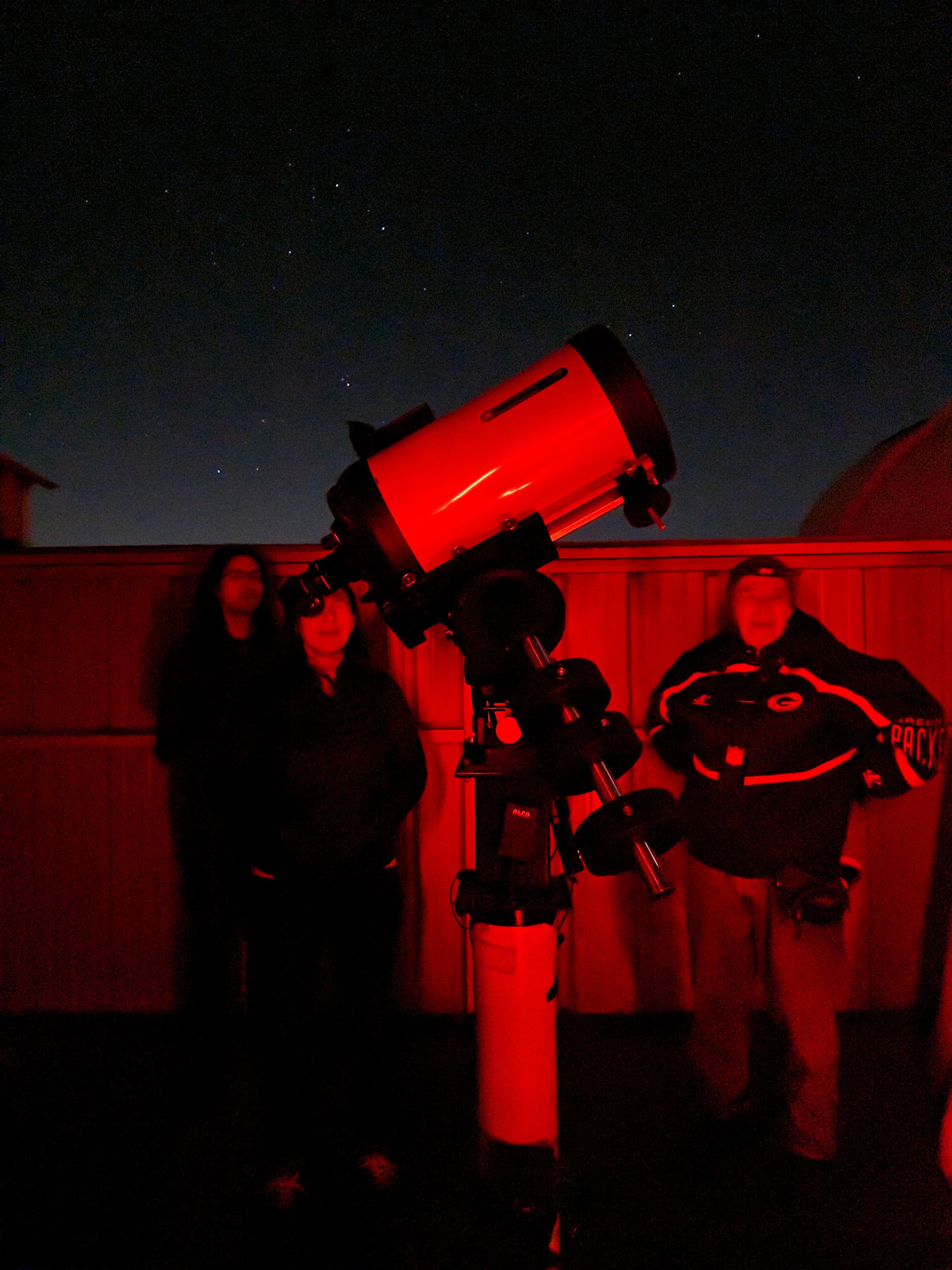 It was a true “planet parade” night with crystal clear viewing through the C14! Dave and I managed to catch both Mercury and Venus before the sun set. Unfortunately none of the other members had arrived. But Saturn was next and showed up nicely in the twilight. The Macy family took it all in with us.