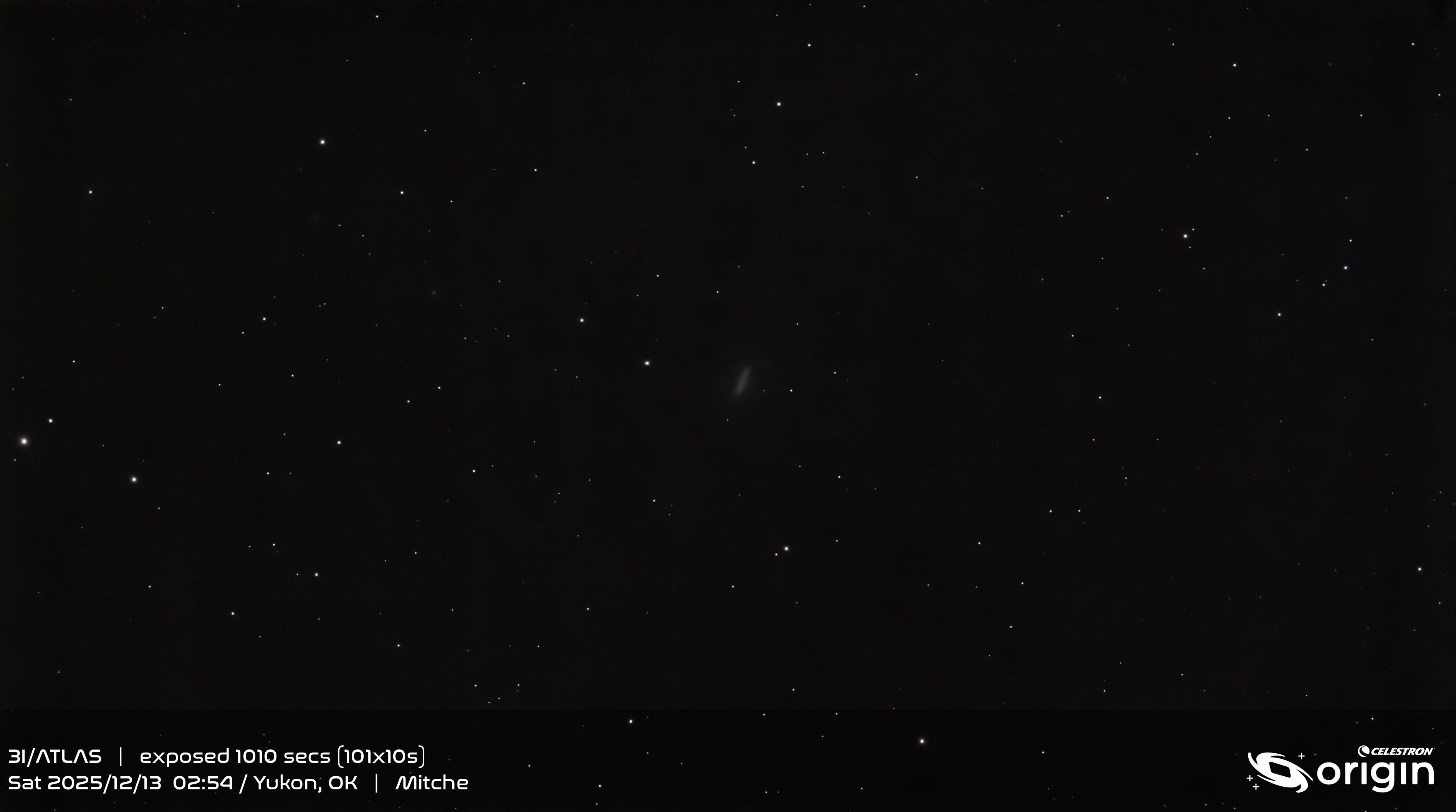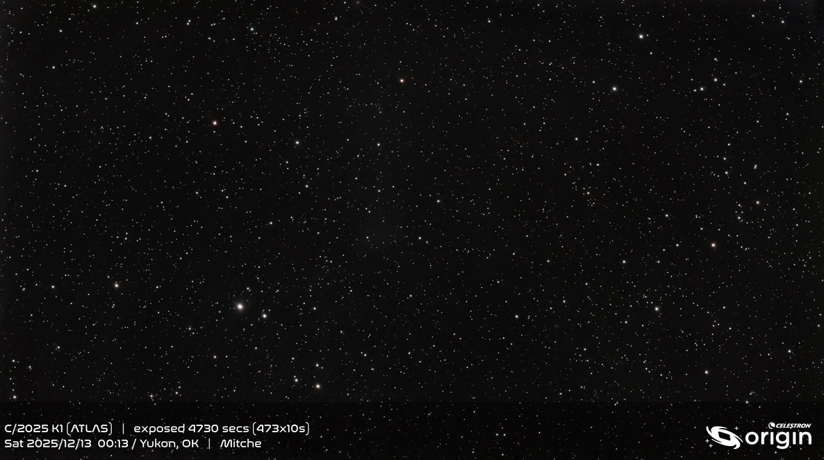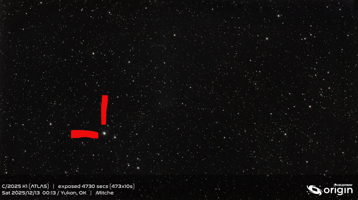 I did a bunch of science observations with my Odyssey, but decided to also set up my Origin to see if I could get C/2025 N1 (3I Atlas). I got it. Not the world’s best shot of it, but I’m glad I finally managed to get a halfway decent shot of it before it leaves us.
