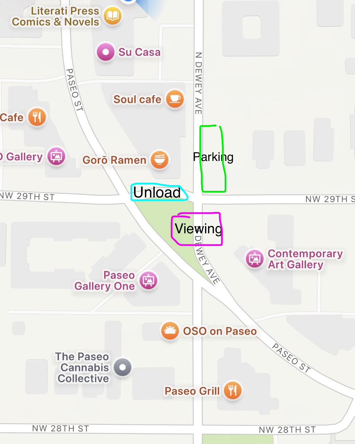 The folks at the Art District will reserve at least two, and possibly as many as four, parking places for us. The layout has changed a little bit. There’s no on street parking by the island any more. That’s now a grassy area. But I believe we’ll have the two spots in the lot to the east of, and next to, that grassy area. Plus maybe a couple around the corner to the east, or maybe to the north. We might have to rotate cars through there for folks to unload. There’s also enough room to unload from the street, as long as it doesn’t take more than a few minutes.