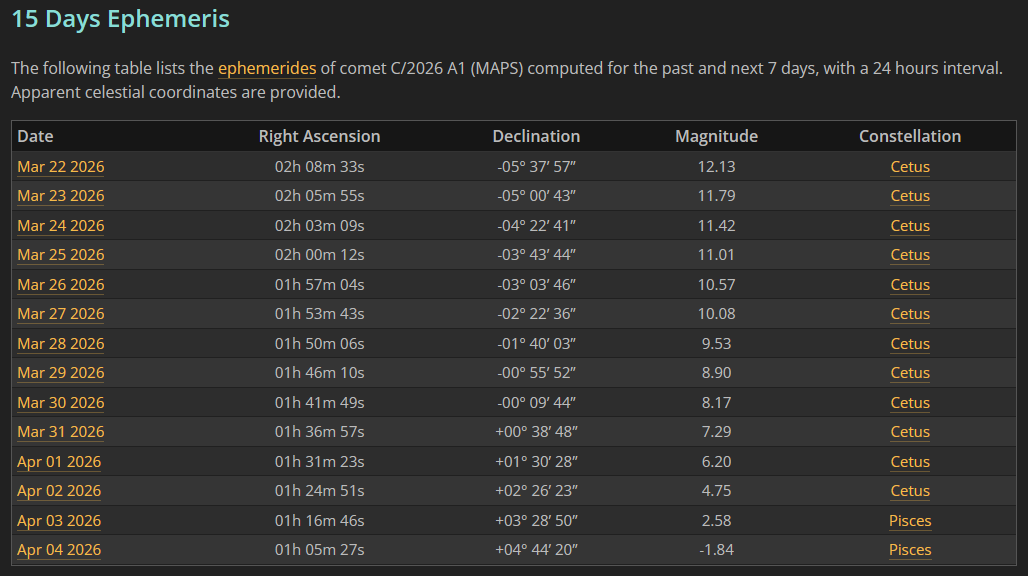 If anyone is interested in C/2026 A1 (MAPS), this information will get you / us through the first weekend in April. Here are Rise & Set times for OKC. Have fun with it!