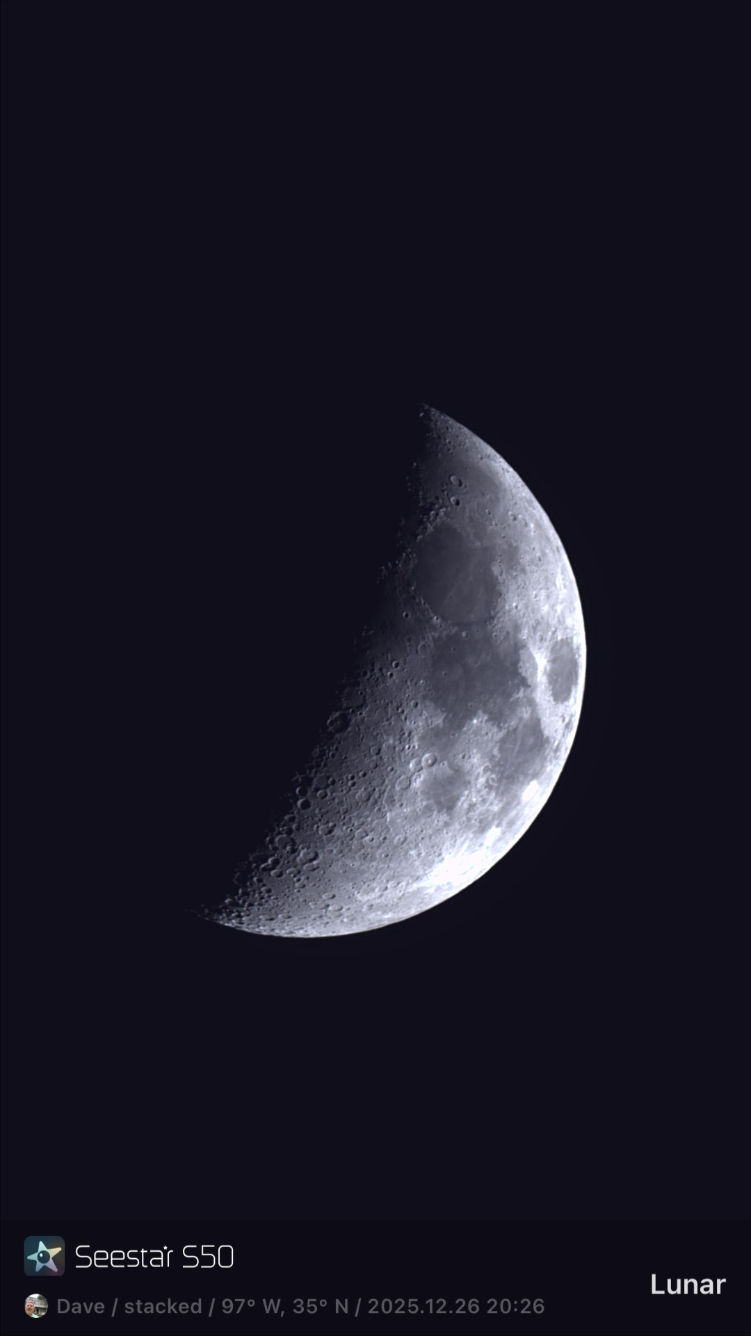 Took these last night. Had a little bit of wind and poor seeing. The Moon picture is a stack from a 10 minute video. This is the first time I tried this on the S50. It was low and getting ready to go behind a tree. I also connected to the S50 using remote control, while having lunch 18 miles away, to see the progress of the Moon stacking.