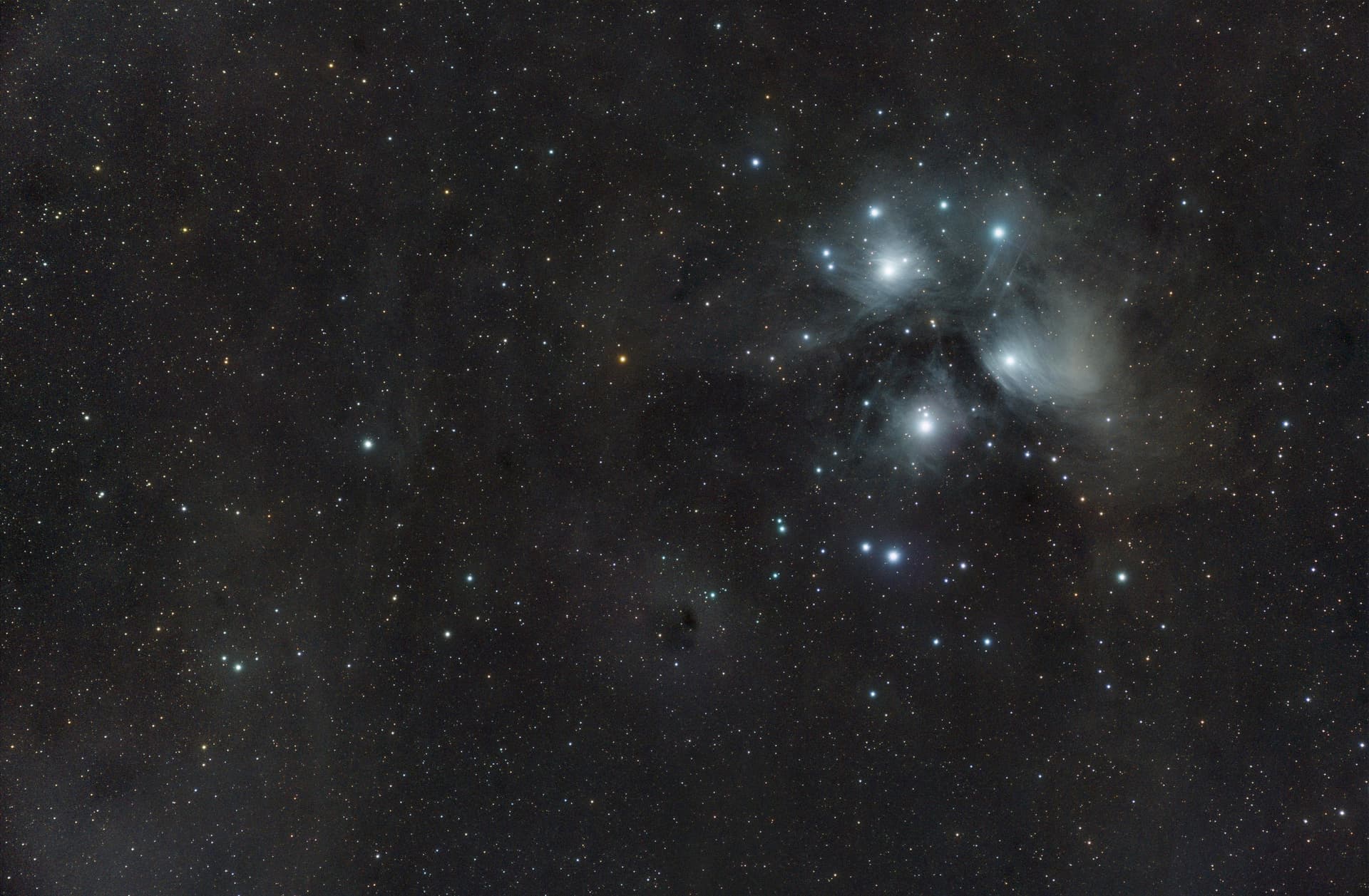 This is M45 the Seven Sisters. I imaged it last month over a 4 night period. Equipment used was my sigma 150-600mm (@300mm) and my Canon T3i DSLR (uvircut filter) on a SA GTI mount. Processed in Siril and SAS Pro.